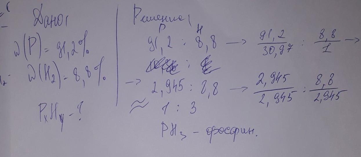 Помогите пожалуйста! Рассчитайте формулу соединения, знаю что составь вещества входят элементов фосфор (его массовая доля составляет 91,2%) и элемент водород.