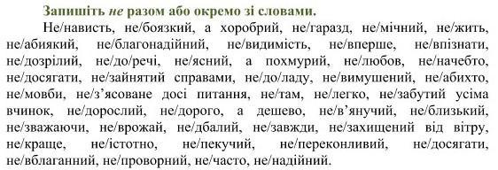 Ответ:ненависть, не боязкий, а хоробрий, негаразд, немічний, нежить, неабиякий, не благодійний, невидимість, не вперше, не впізнати, не дозрілий, не до речі, не ясний, а похмурий, не любов, неначебто, недосягати, не зайнятий справами, не до ладу, не вимушений, неабихто, немовби, не з'ясоване досі питання, не там, нелегко, не забутий усіма вчинок, не дорослий, недорого, а дешево, нев'янучий, не близький,не зважаючи, не врожай, недбалий, не завжди, не захищений від вітру, не краще, не істотно, не пекучий, непереконливий, не досягати, невблаганний, не повторний, не часто, ненадійний