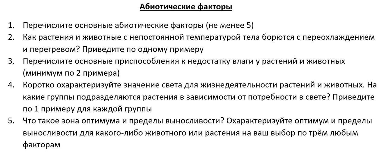 1. Влажность; свет; температура; давление; осадки; рельеф; концентрация.