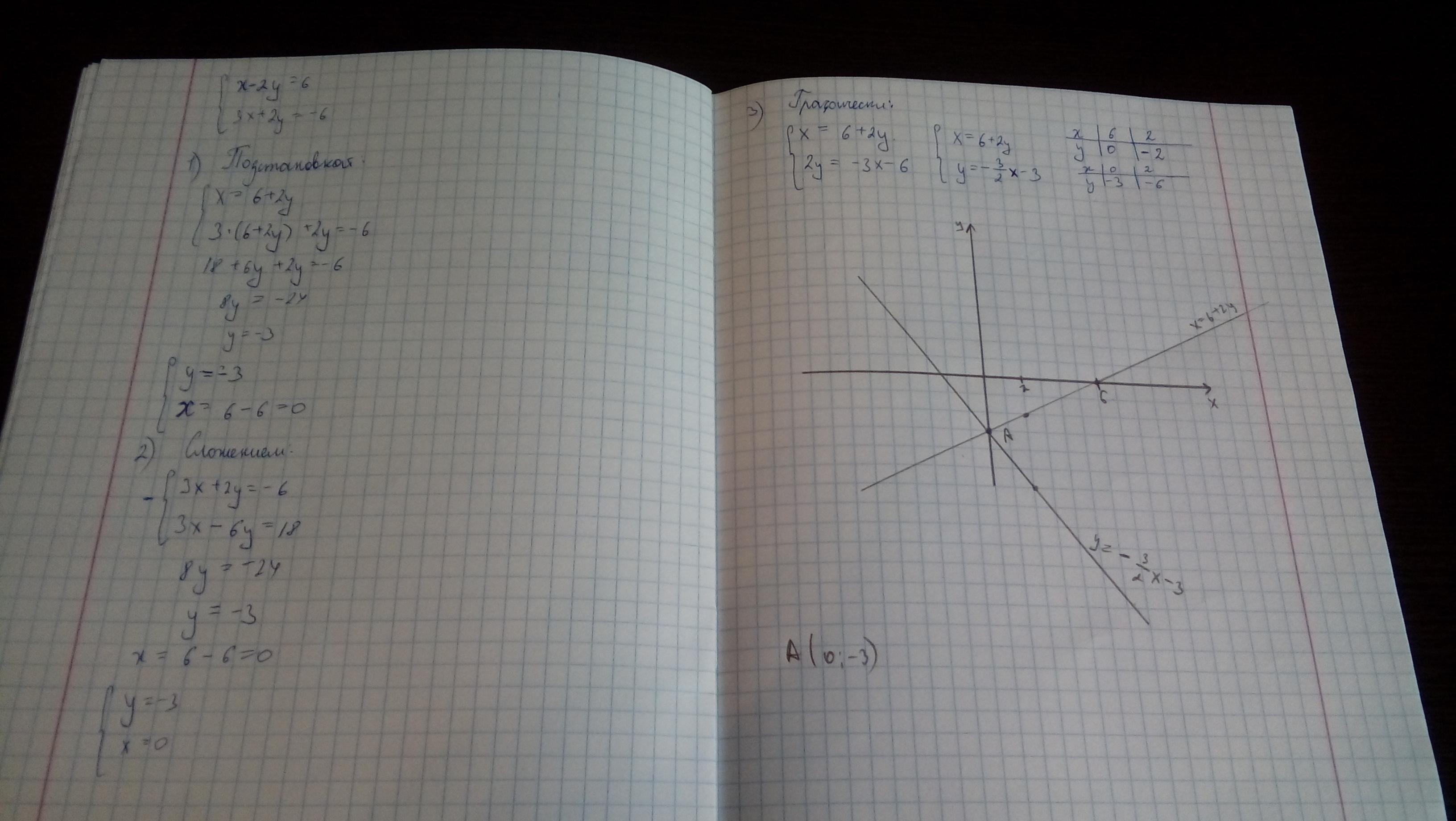 Найдите точку пересечения двух прямых х – 2у = 6 и 3х + 2у = -6.