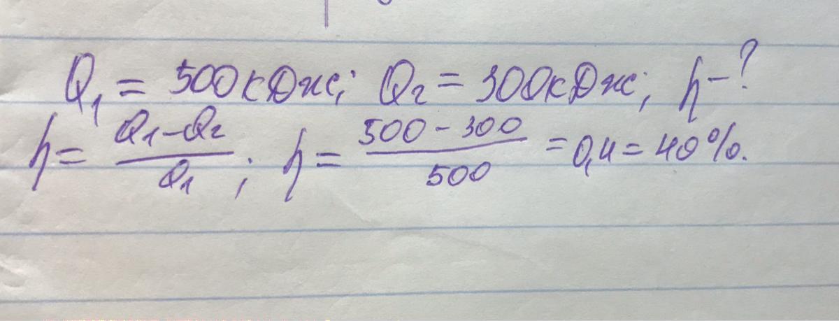 Теплова машина одержала від нагрівника кількість теплоти 500кДЖ і передала холодильнику кількість теплоти 300кДЖ.Який ККД теплової машини?