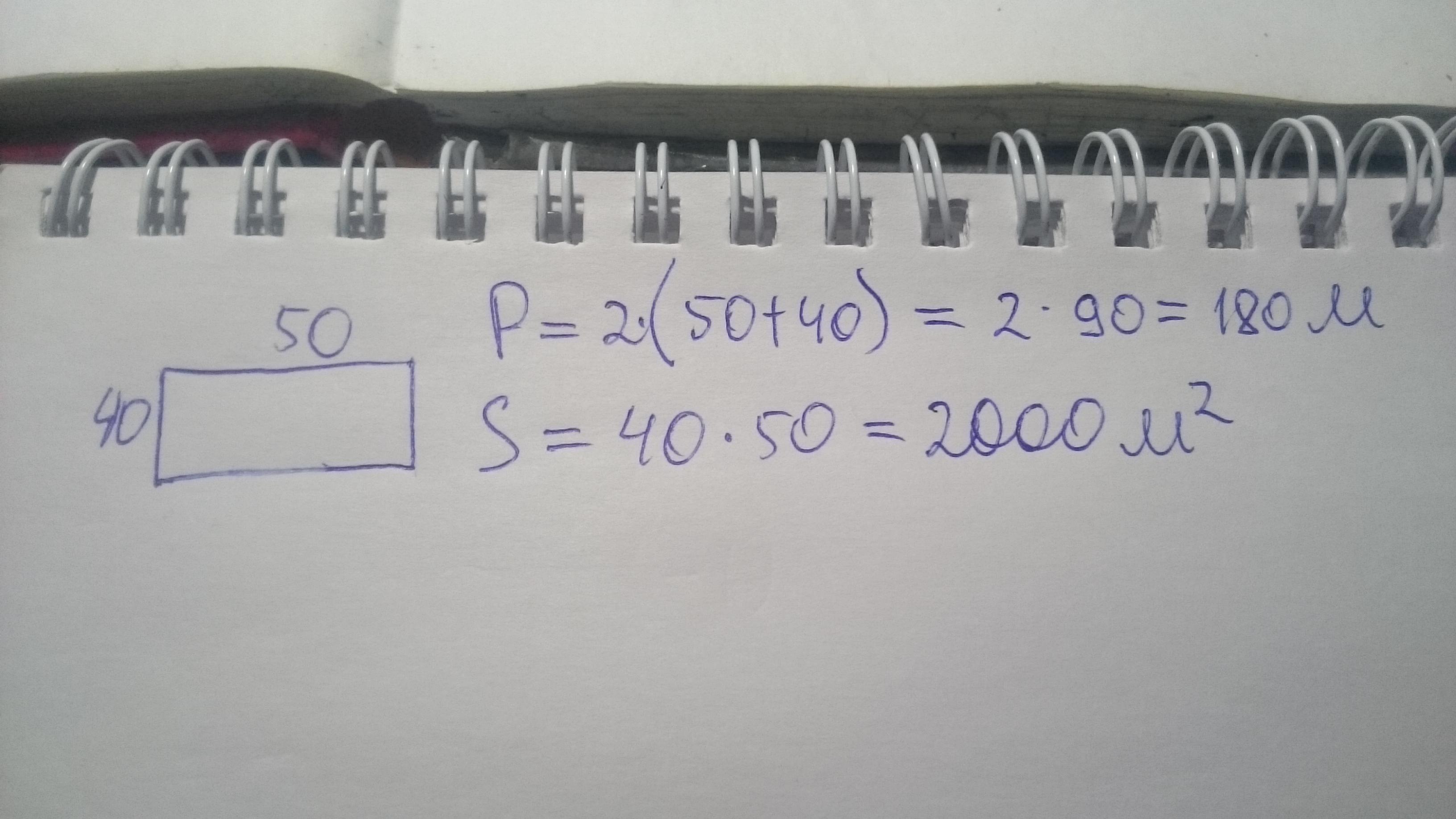 Прямоугольный участок земли имеет ширину 40м и длину 50м .Вычеслите площадь и периметр участка .