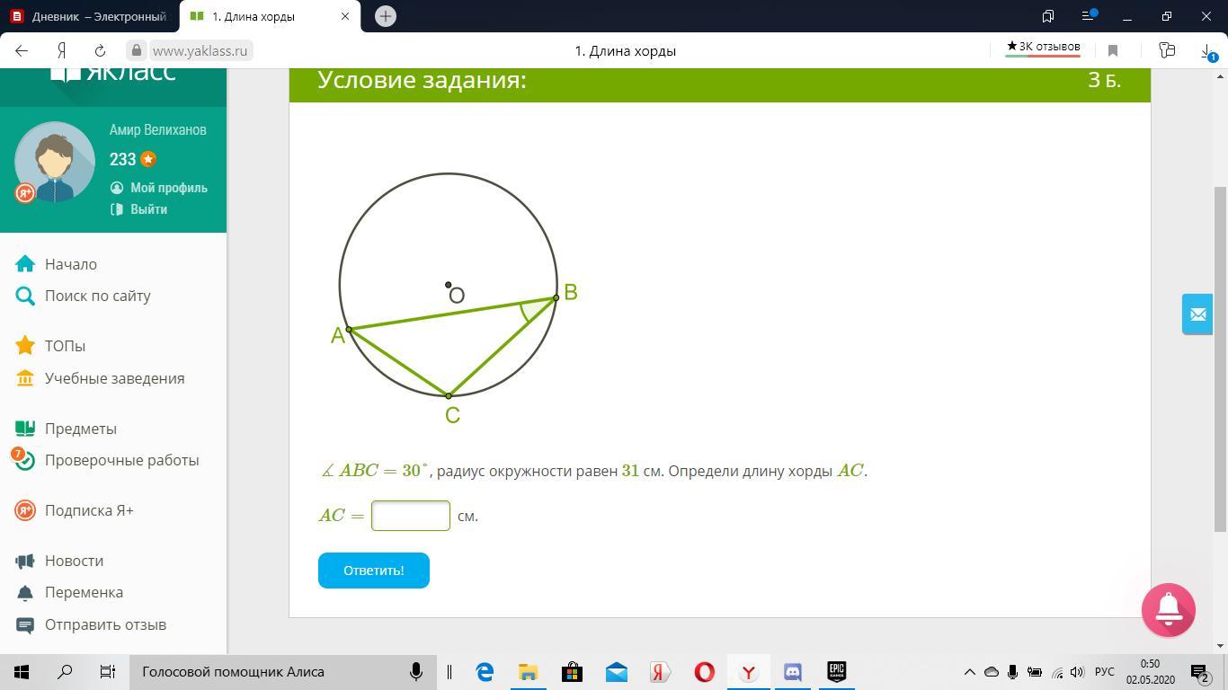 СРОЧНОООООО!!!!! ∡ABC=30°, радиус окружности равен 31 см. Определи длину хорды AC. ДАЮ 50!!!!!