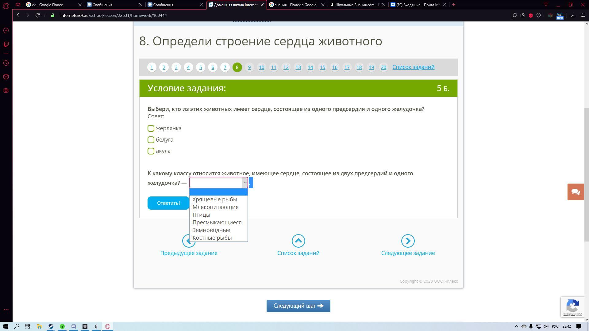 К какому классу относится животное, имеющее сердце, состоящее из двух предсердий и одного желудочка? — .