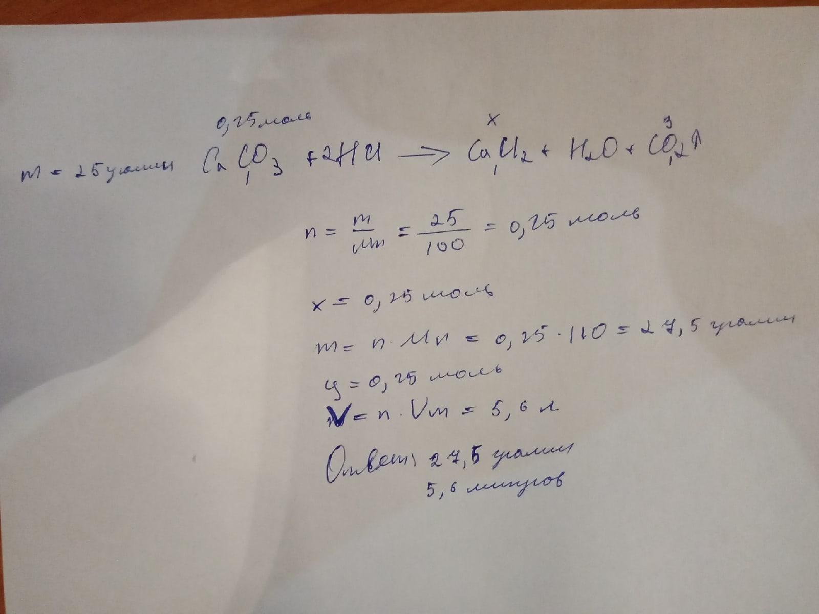5. На кальцій карбонат масою 25 г подіяли розчином хлоридної кислоти. Яка маса утвореної солі? Який об'єм карбон (IV) оксиду виділився при цьому?