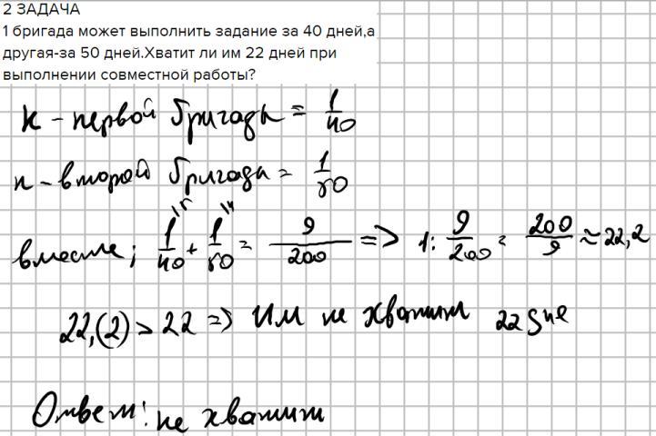 1 бригада может выполнить задание за 40 дней,а другая-за 50 дней.Хватит ли им 22 дней при выполнении совместной работы?