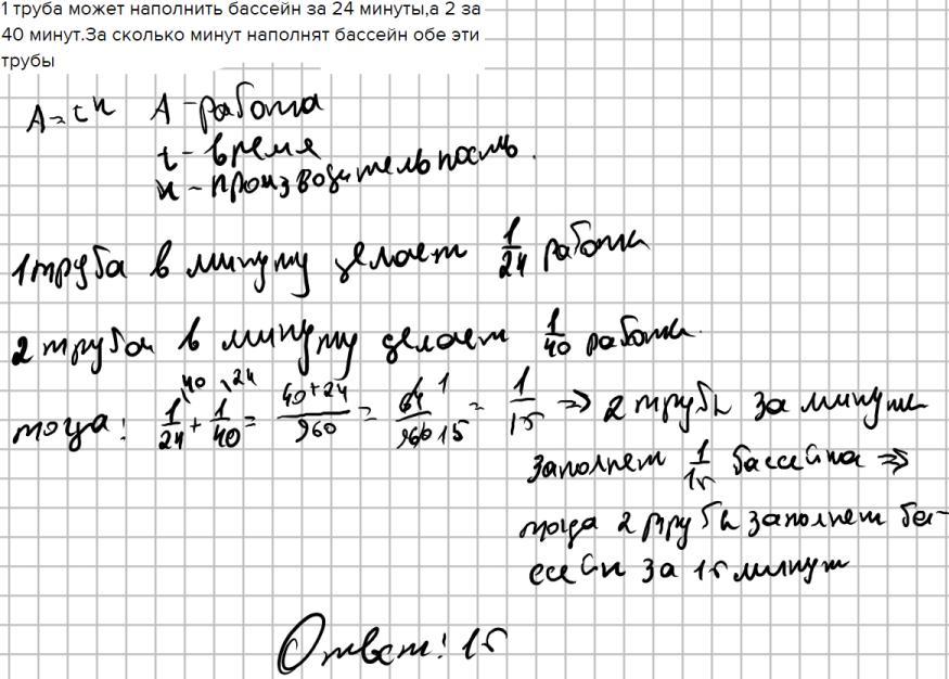 1 труба может наполнить бассейн за 24 минуты,а 2 за 40 минут.За сколько минут наполнят бассейн обе эти трубы
