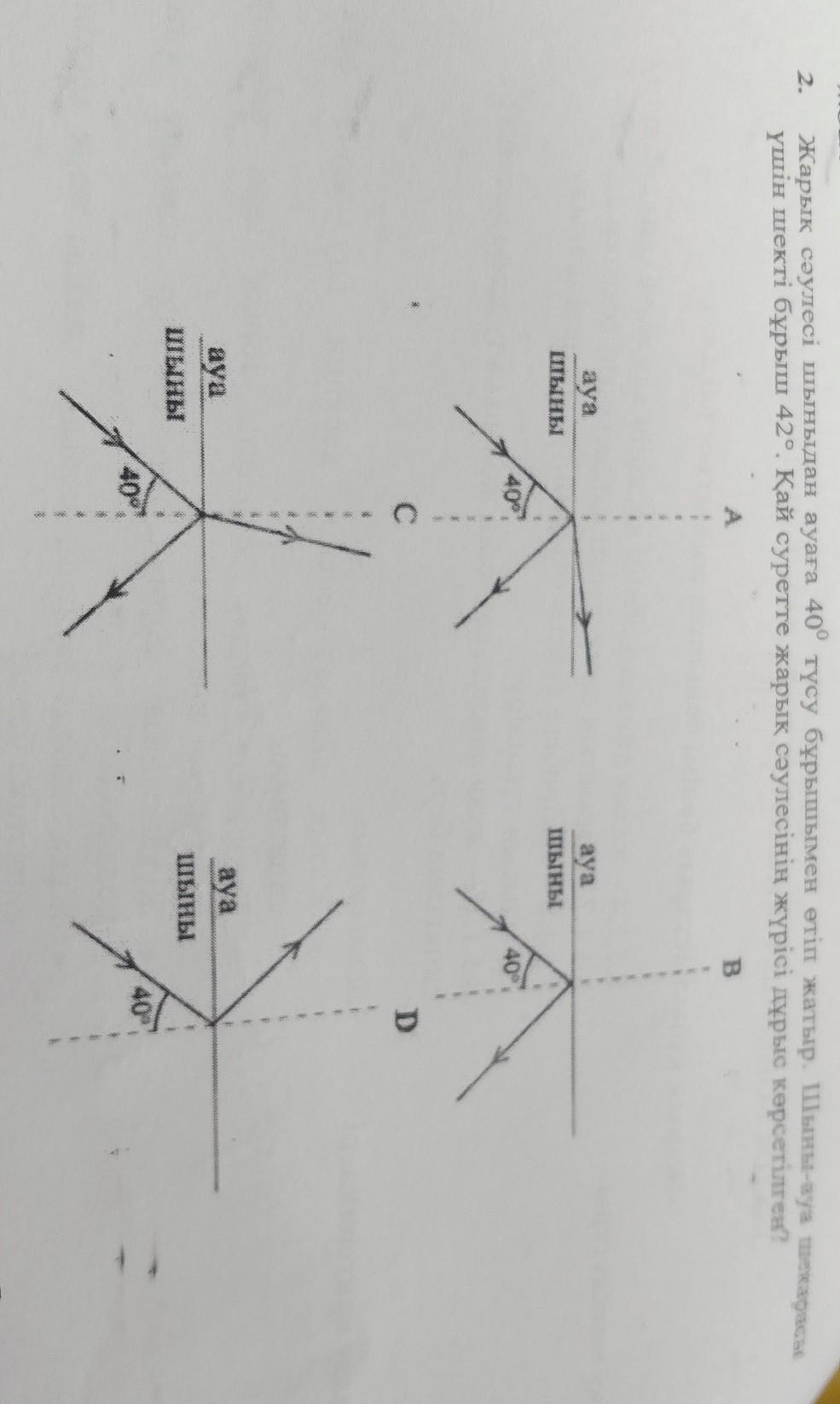 жарық сәулесі шыныдан 40⁰түсу бұрышымен өтіп жатыр .Шыны -ауа шекарасы үшін шеткі бұрыш 42⁰.Қай суреттер жарық сәулесінің жүрісі дұрыс көрсетілген?сори но это физика