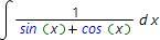 int dfrac{dx}{sinx+cosx}=Big[; t=tgfrac{x}{2}; Big]=int dfrac{dt}{(1+t^2)cdot (frac{2t}{1+t^2}+frac{1-t^2}{1+t^2})}=\\\=int dfrac{dt}{-(t^2-2t-1)}=-int dfrac{d(t-1)}{(t-1)^2-2}=-dfrac{1}{2sqrt2}cdot lnBig|dfrac{t-1-sqrt2}{t-1+sqrt2}Big|+C=\\\=dfrac{1}{2sqrt2}cdot lnBig|dfrac{tgfrac{x}{2}-1-sqrt2}{tgfrac{x}{2}-1+sqrt2}Big|+C