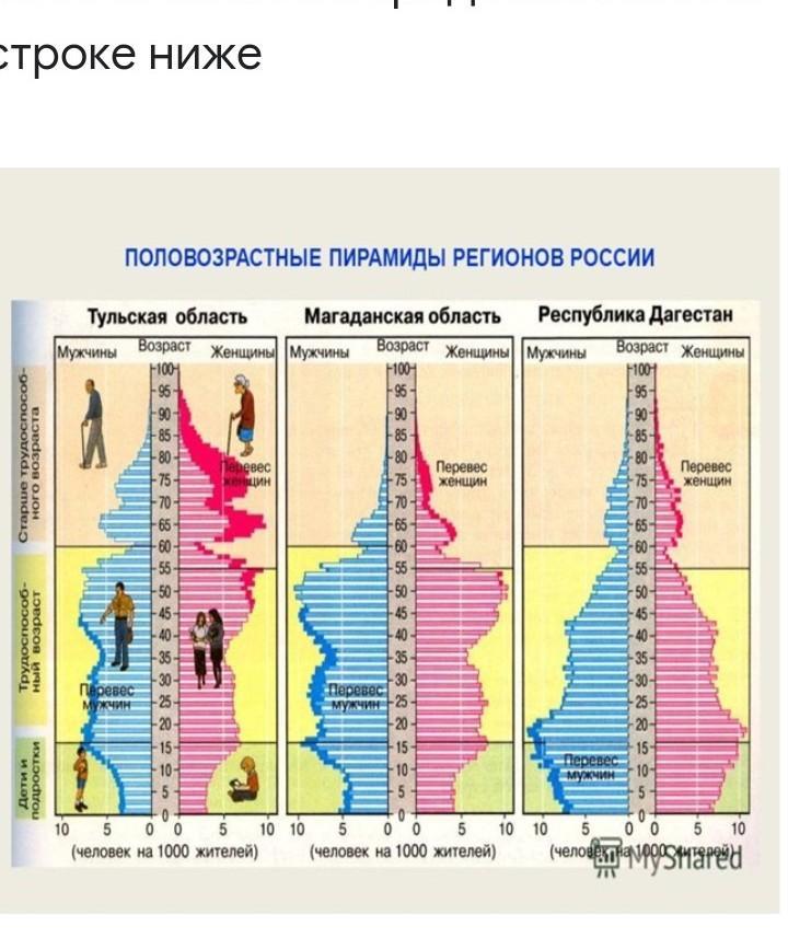 1. Используя рисунок половозрастных пирамид регионов России, определите соотношение полов трудоспособного населения, детей и подростков.