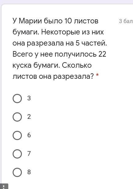У Амиры было 10 листов. некоторые она разрезала на 5 частей. Всего у неё получилось 22 куска бумаги Сколько листов она разрезала?