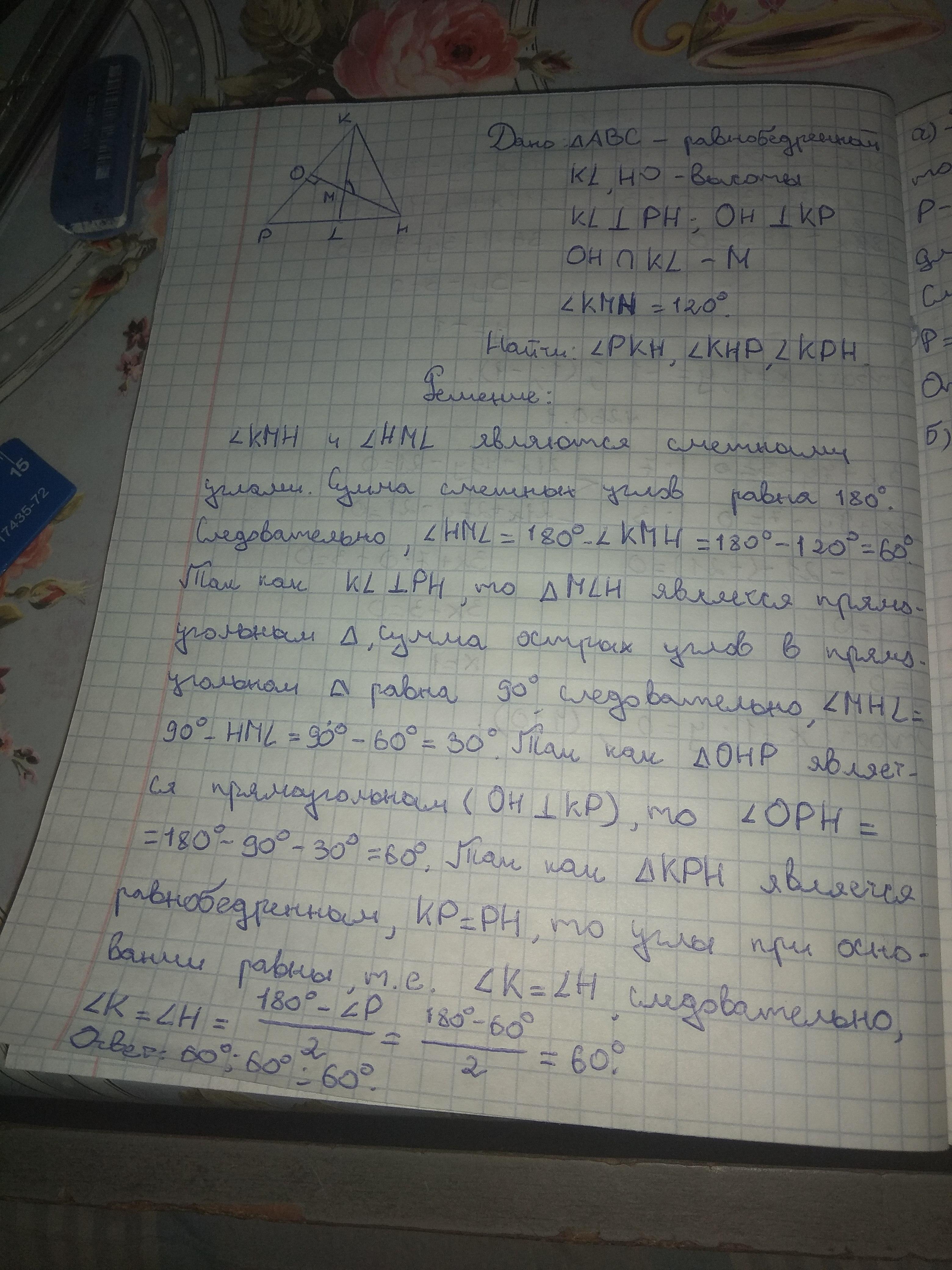 Высоты проведенные к боковым сторонам kp и ph равнобедренного треугольника пересекаются в точке M. Найдите все углы треугольника KPH, если угол KMH-120°.