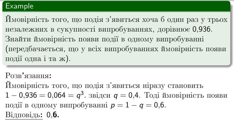 Ймовірність того, що подія з'явиться хоча б один раз у трьох незалежних
