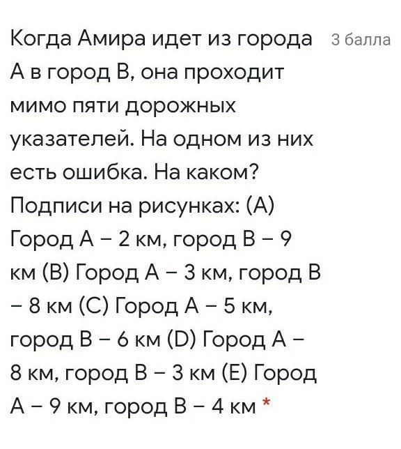 расстояние между городами = 11 км, а значит ошибка на рисунке Е (9+4=13, что больше 11)