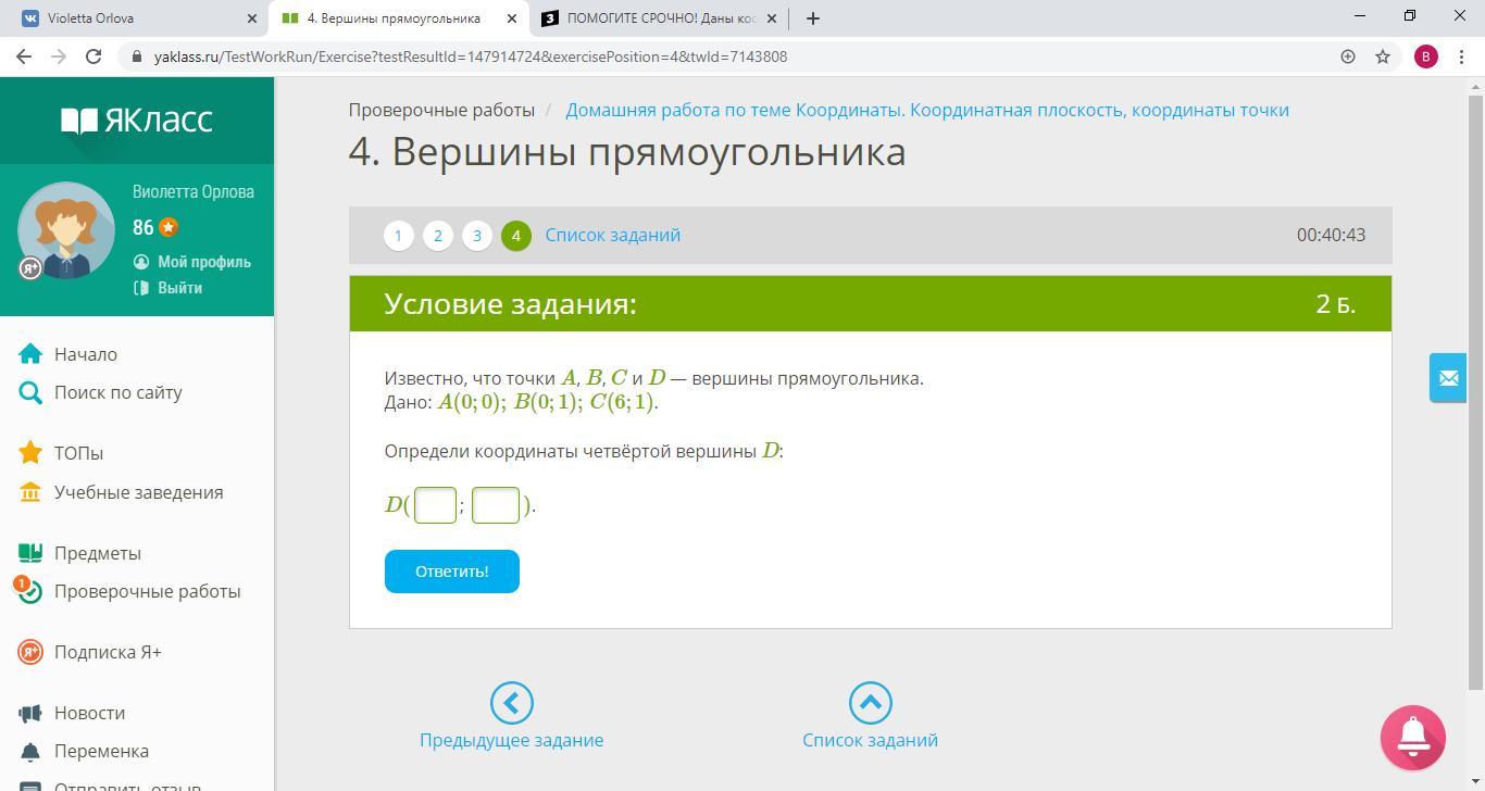 A=0;0 нижний левый угол В=0;1 нижний правый угол, то есть слева второй координат 0,а справа 1,в верхних углах первый 6, а правый верхний угол уже занят,значит D=6;0