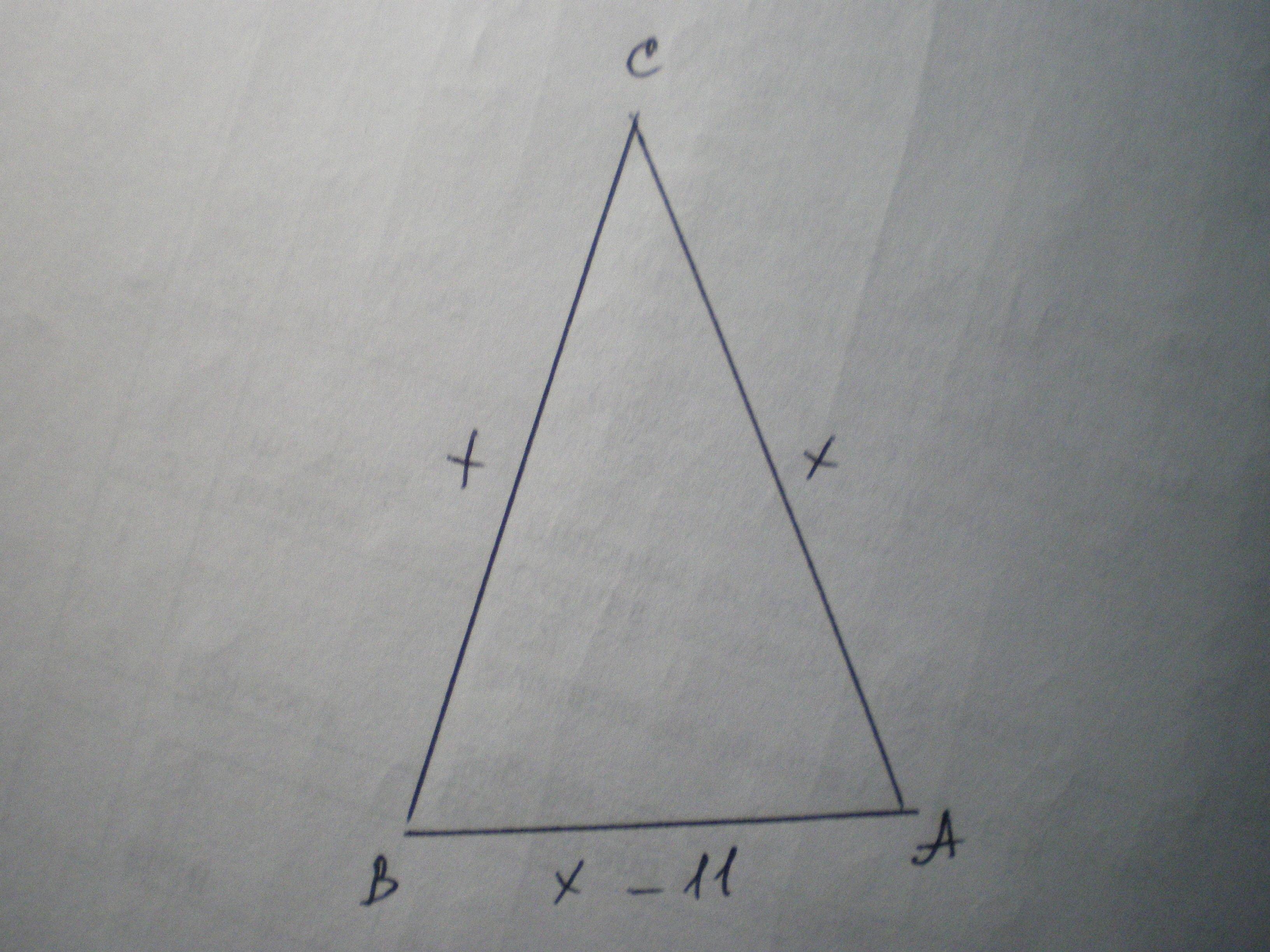 Пусть АС=ВС=х дм, тогда АВ=х-11 дм.