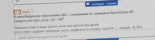 в равнобедренном треугольнике abc с основанием ac проведена биссектриса ad найдите угол адс если б 156