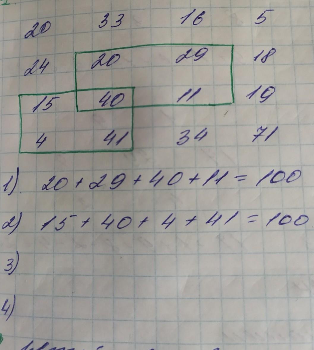 найдите четыре группы чисел каждый из которых сумма должна равняться 100. Как на примере 1 и 2