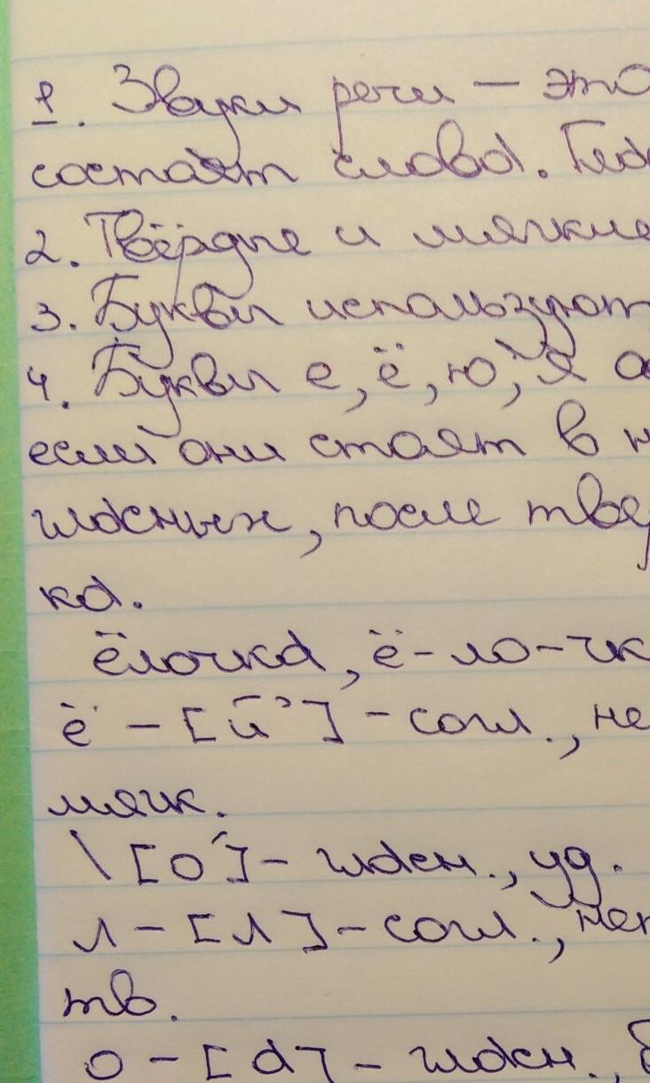 1.Звуки речи – это звуки, из которых состоят слова. Гласные и согласные. 2.Твёрдые и мягкие . 3. Буквы используют для построения слов . 4.буквы е, ё, ю, я обозначают два звука, если они стоят в начале слова, после гласных, после твердого и мягкого знака.
