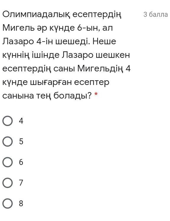 6 куннин ишинде Лазаро шешкен есептердын саны Мигельдин 4 кунде шыгарган есептер санына тен болады