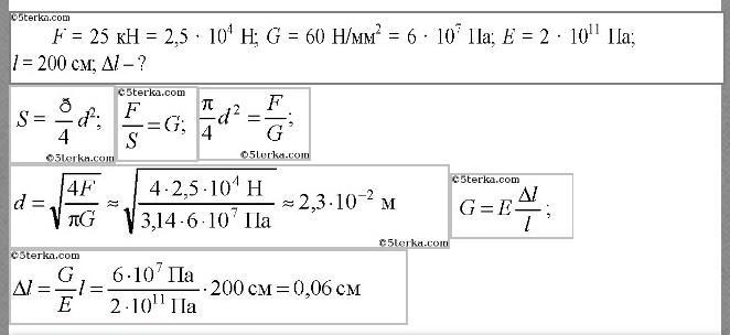 Какого диаметра нужно взять стальной стержень чтобы во время нагрузки 25 кН механическое напряжение равнялась 60МПа. Какое абсолютное удлинение стрежня если его начальная длина 200 см ?