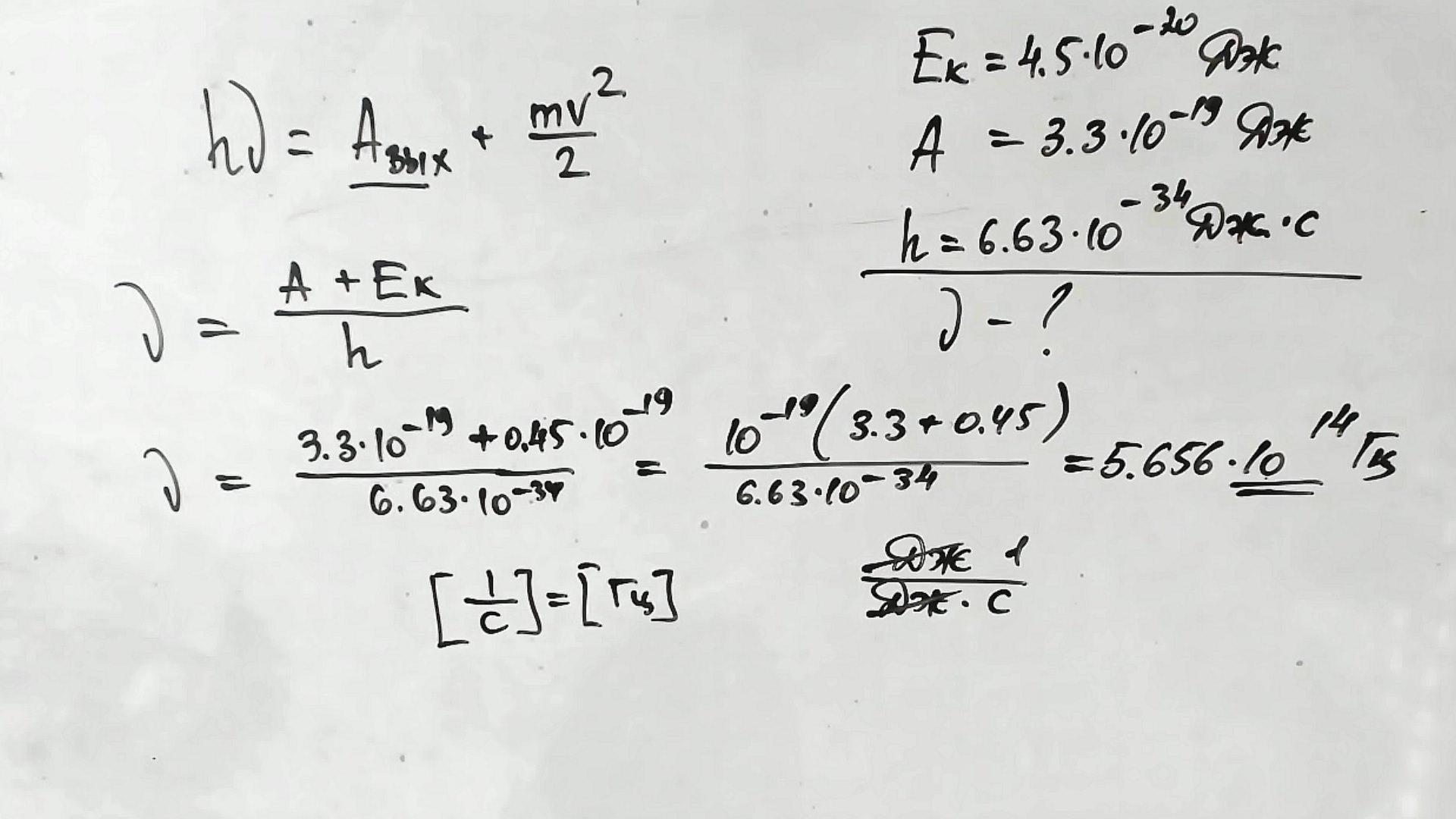 Определите частоту света, которым освещается поверхность металла, если фотоэлектроны имеют кинетическую энергии 4,5·10-20Дж, а работа выхода равна 3,3·10-19Дж. (Һ= 6,63·10-34 Дж·с)