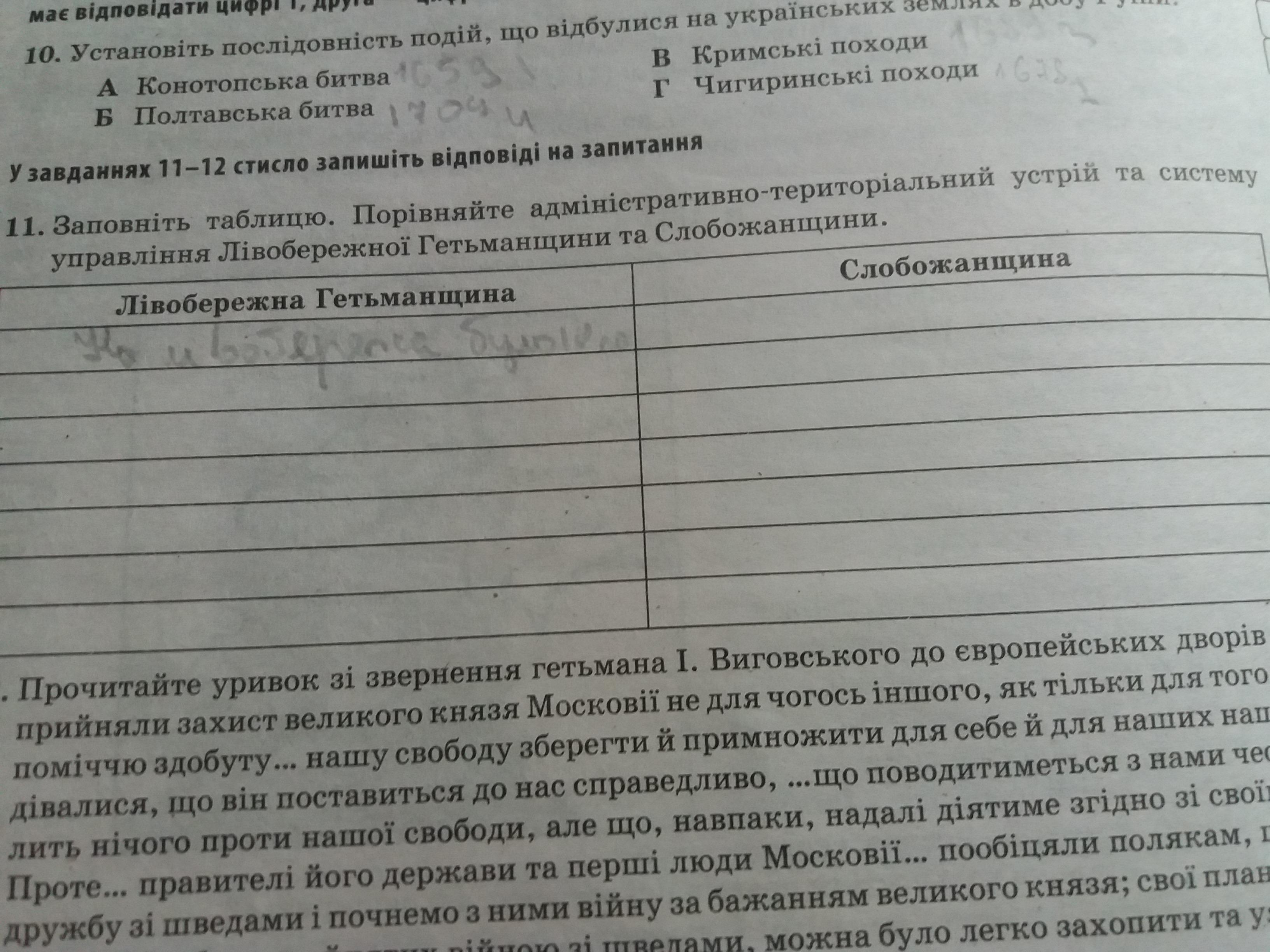 11.заповніть таблцю. Порівняйте адміністративну-територіалььний устрій та системи управління Лівобережної Гетьманщини та Слобожанщини