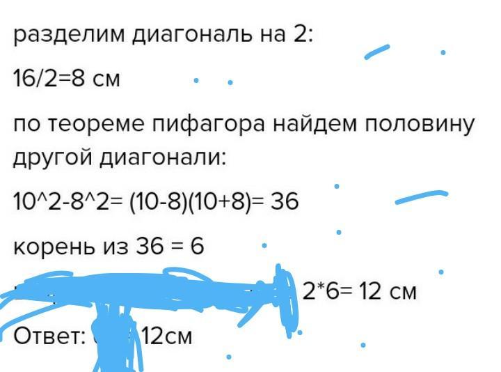 Сторона ромба равна 10. Длина одной из диагоналей равна 16. Найди длину другой диагонали.