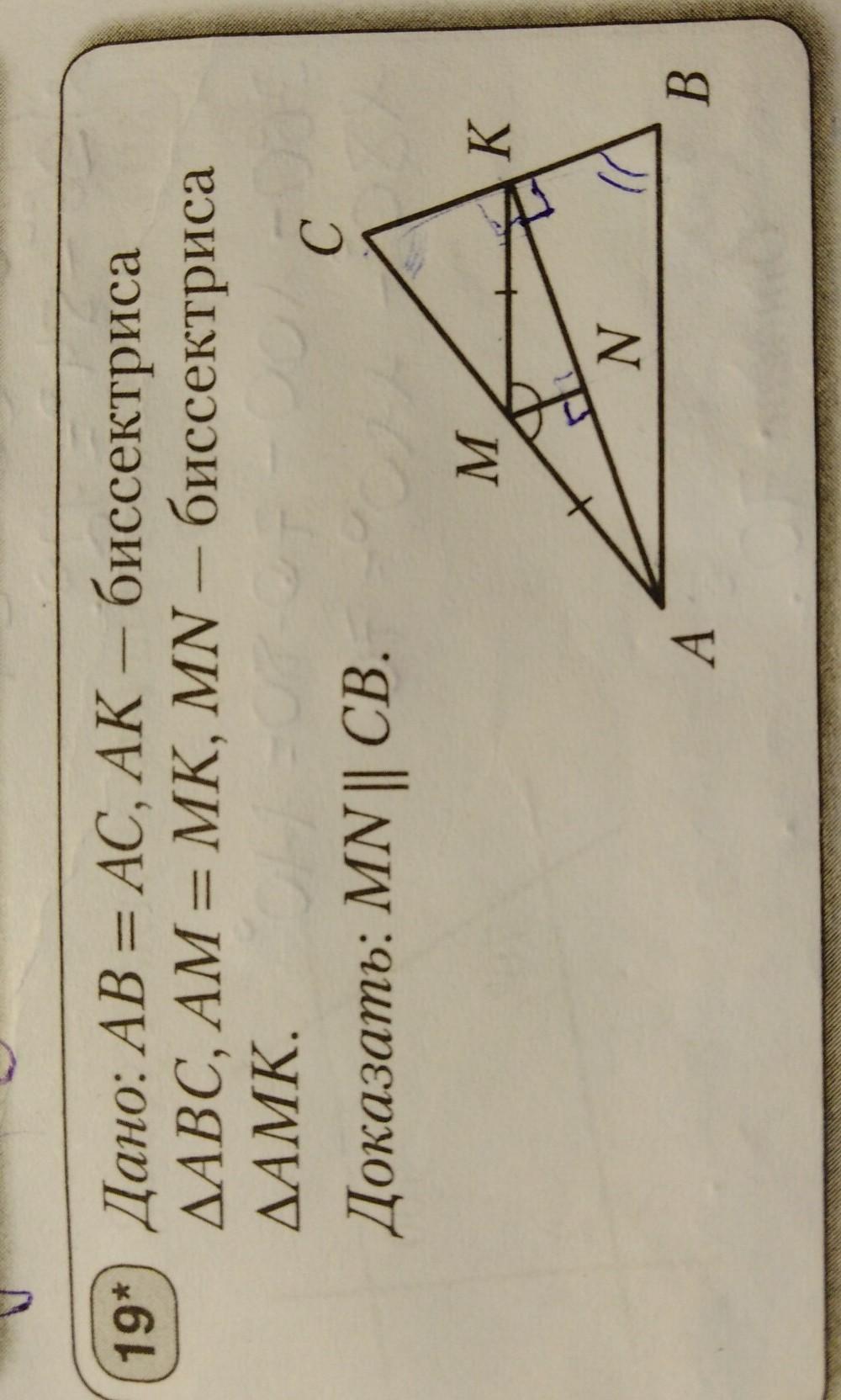 Дано:AB=AC, AK- биссектриса ABC, AM=MK, MN--биссектриса AMK