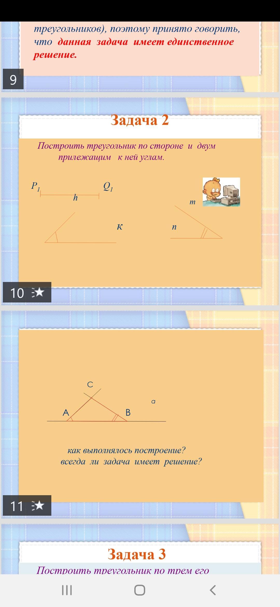 Рисуновк, как построить треугольник по одной стороне и углам приведен в самом задании на рисунке ниже (11). Берём отрезок, от его концов рисуем лучи под нужным уголом и на месте пересечения лучей отмечаем третью вершину треугольника.