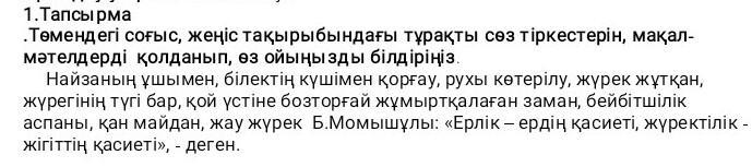 Б.Момышұлы : Ерлік ердің қасиеті,жүректілік - жігіттің қасиеті ,-деген.Ол найзаның ұшымен,білектің күшімен қорғаған.Б.Момышұлы өте батыл адам.Біз үшін жанын беріп жүрек жұтқан.Қазақ деген ел болсын деп барлығы қан майданға аттанды.