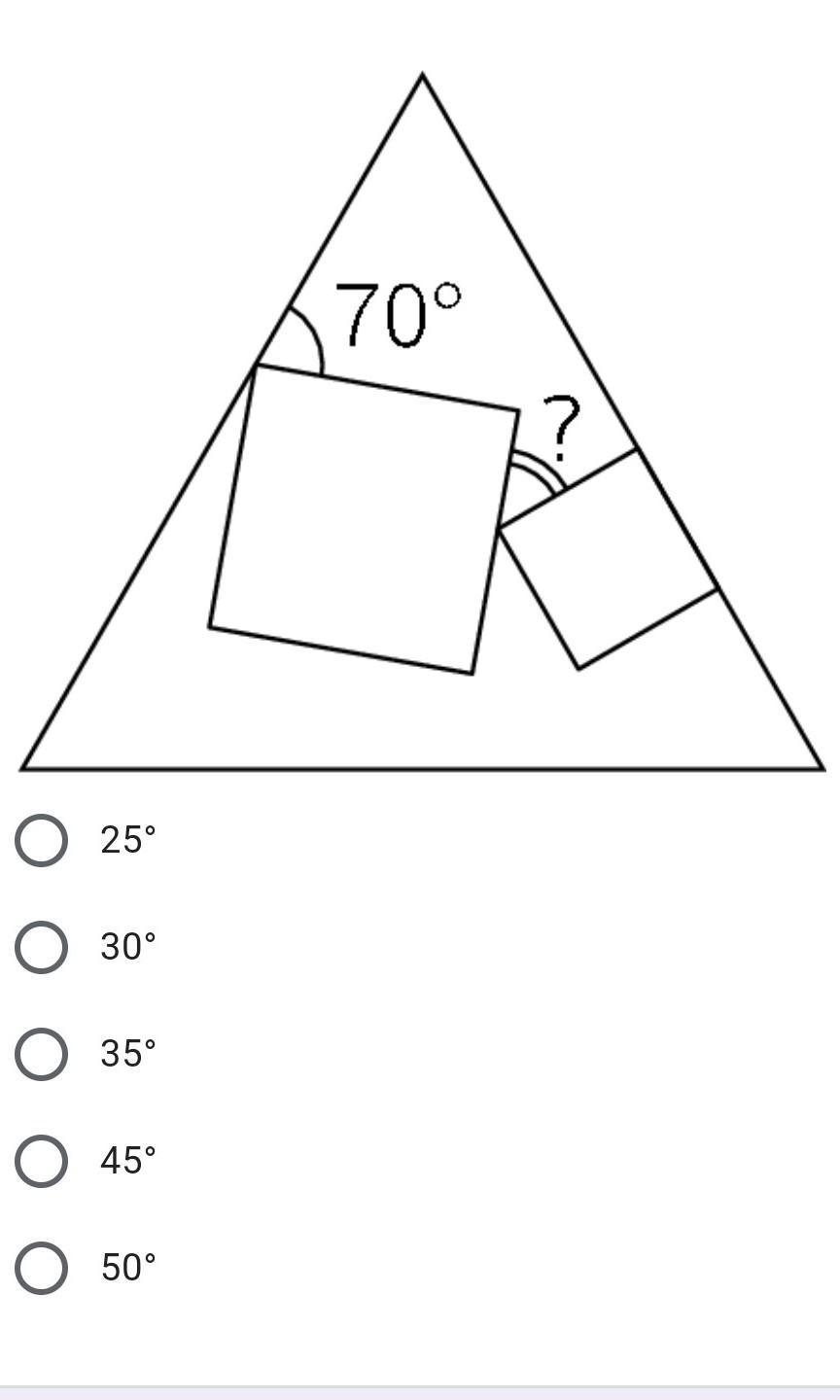 Внутри прямоугольного треугольника два разных квадрата: верх одного и сторона другого лежат по бокам треугольника (см. Рисунок). Каково значение угла, под которым расположен знак вопроса? *