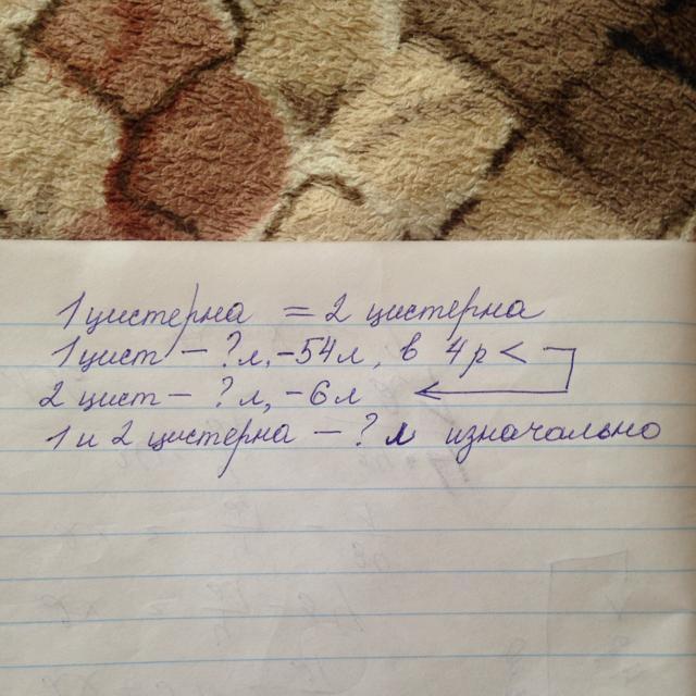 Пусть х л воды было в каждой цистерне первоначально, тогда (X-54) л воды стало в первой цистерне, а (x-6) л воды стало во второй цистерне.