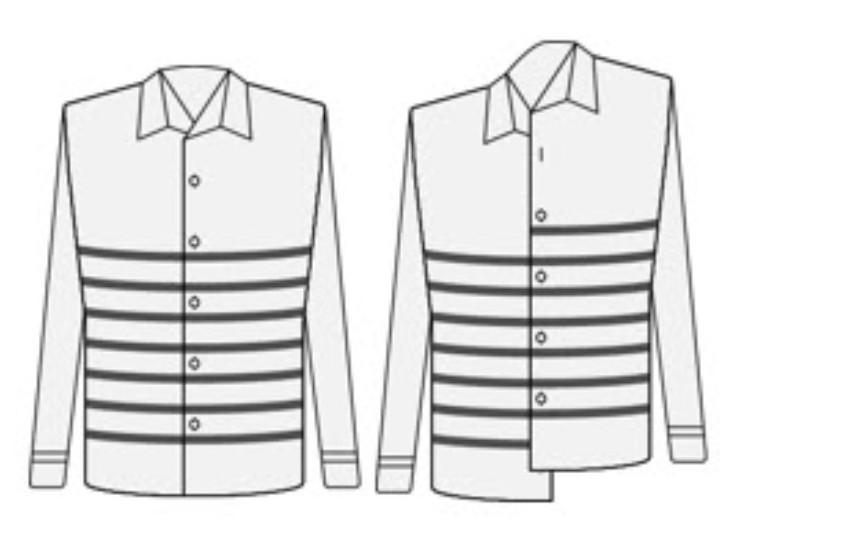 Если бы Космо застегнул свою новую рубашку правильно, полосы на рубашке обернулись бы вокруг его тела с 7 кругами (изображение слева). Этим утром он поспешно неправильно застегнул рубашку (фото справа). Сколько полосок на его рубашке сейчас?