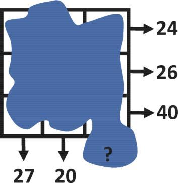 В каждую клетку квадрата 3× 3 вписано число. К сожалению, эту таблицу залило чернилами, но мы знаем суммы чисел, стоящих в каждой строке и в двух столбцах (их указывают стрелочки на рисунке). Чему равна сумма в третьем столбце? *