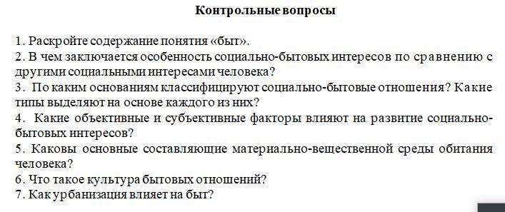 6. Бытовые отношения – это устойчивая система повседневных непроизводственных связей между людьми по поводуудовлетворения их первоочередных потребностей