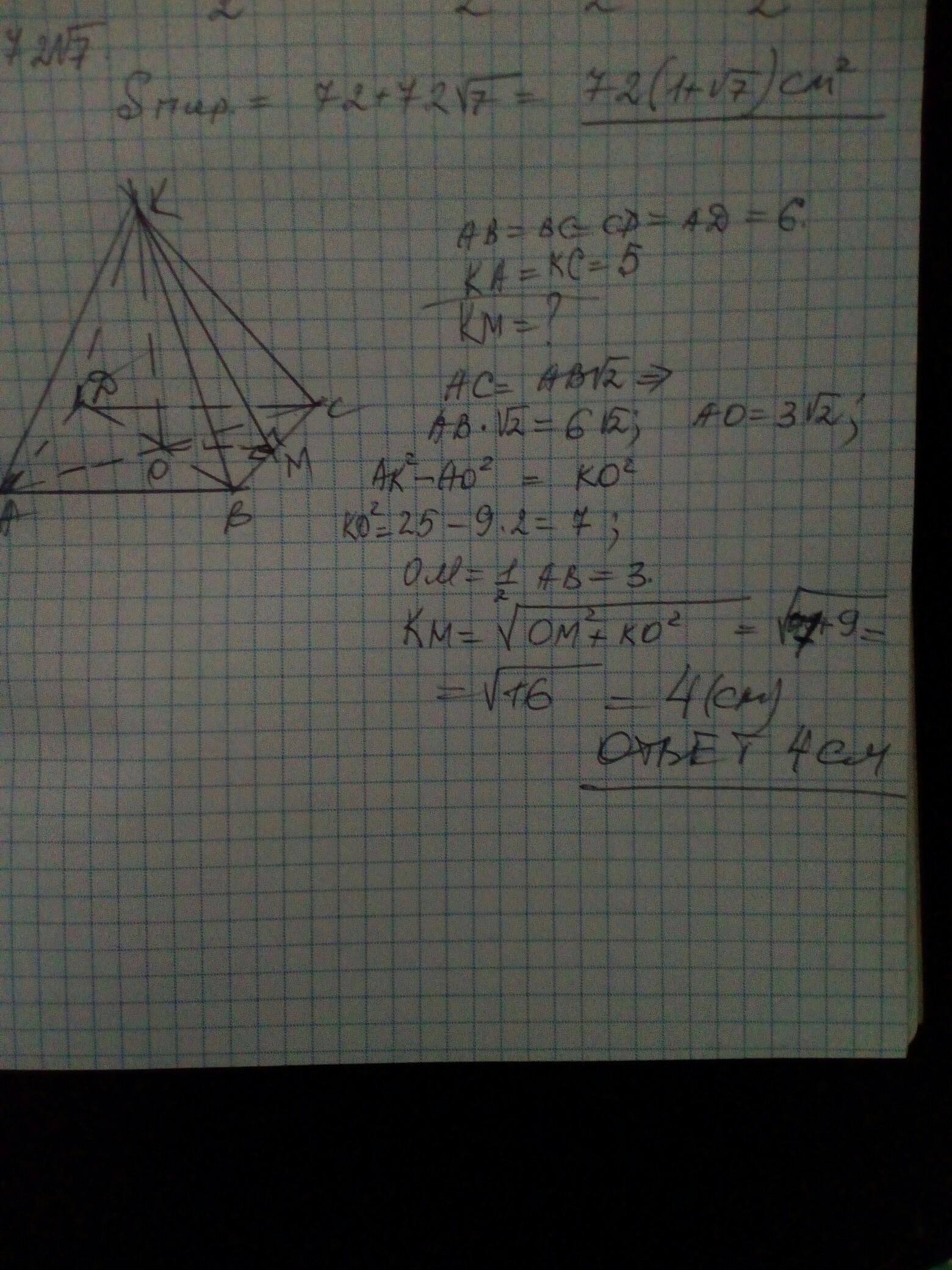 Сторона основания правильной четырехугольной пирамиды равно 6см, а боковое ребро – 5см. Найдите: а) апофему