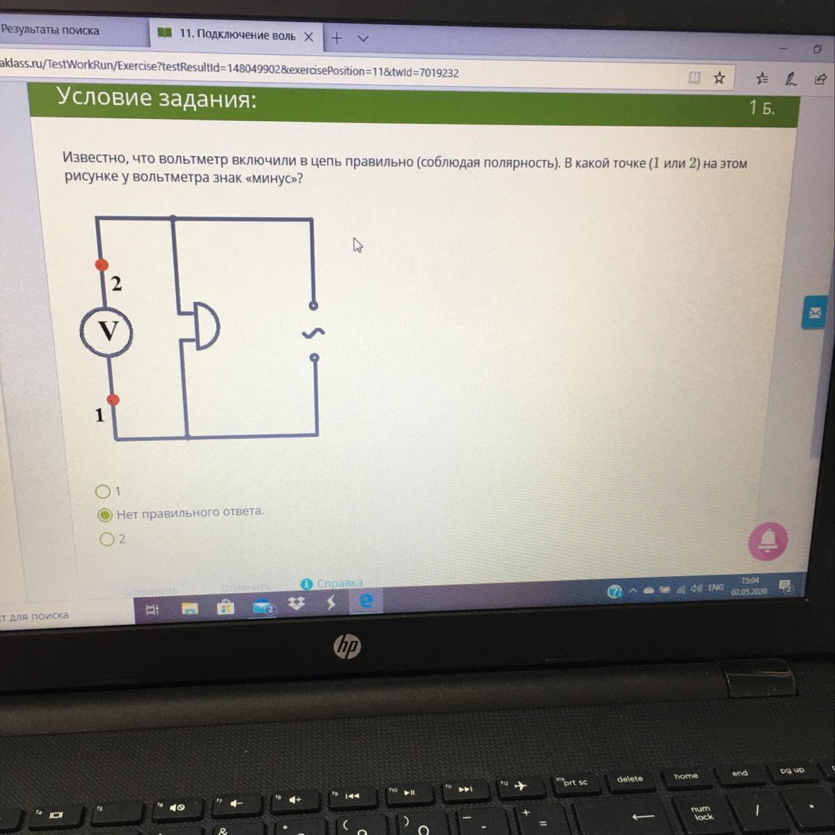 Известно, что вольтметр включили в цепь правильно (соблюдая полярность). В какой точке (1 или 2) на этом