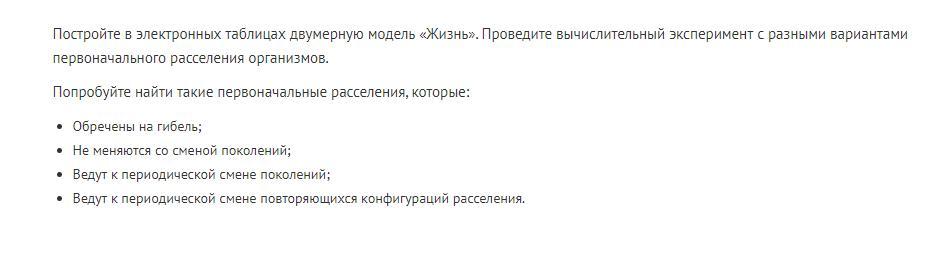 Постройте в электронных таблицах двумерную модель «Жизнь». Проведите вычислительный эксперимент с разными вариантами первоначального расселения организмов.