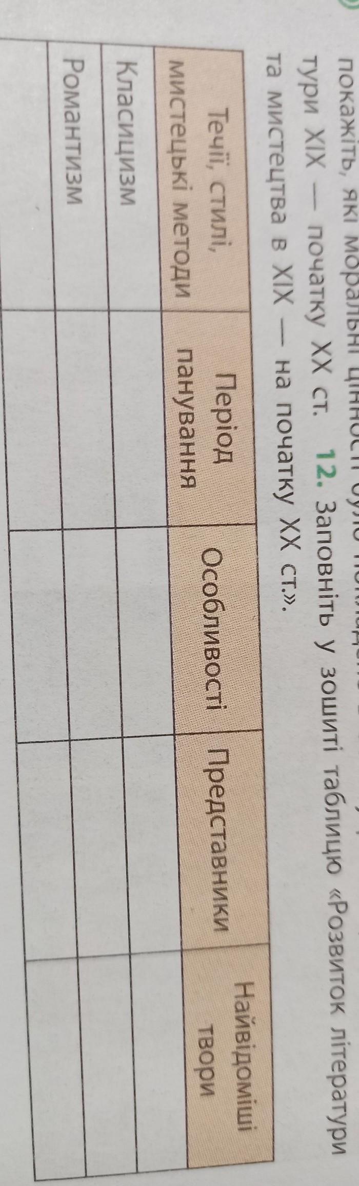 заповніть у зошиті таблицю "Розвиток літератури та мистецтва в xix - на початку xx ст"