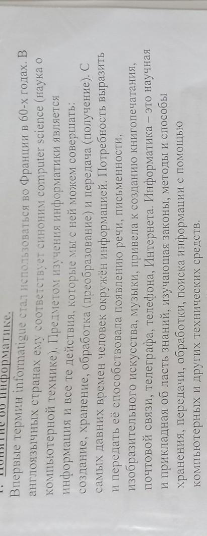 Впервые термин informatique стал использоваться во Франции в 60-х годах. В англоязычных странах ему соответствует синоним computer science (наука о компьютерной технике). Предметом изучения информатики является информация и все те действия, которые мы с ней можем совершать: создание, хранение, обработка (преобразование) и передача (получение). С самых давних времен человек окружён информацией. Потребность выразить и передать её способствовала появлению речи, письменности, изобразительного искусства, музыки, привела к созданию книгопечатания, почтовой связи, телеграфа, телефона, Интернета. Информатика — это научная и прикладная область знаний, изучающая законы, методы и способы хранения, передачи, обработки, поиска информации с помощью компьютерных и других технических средств.