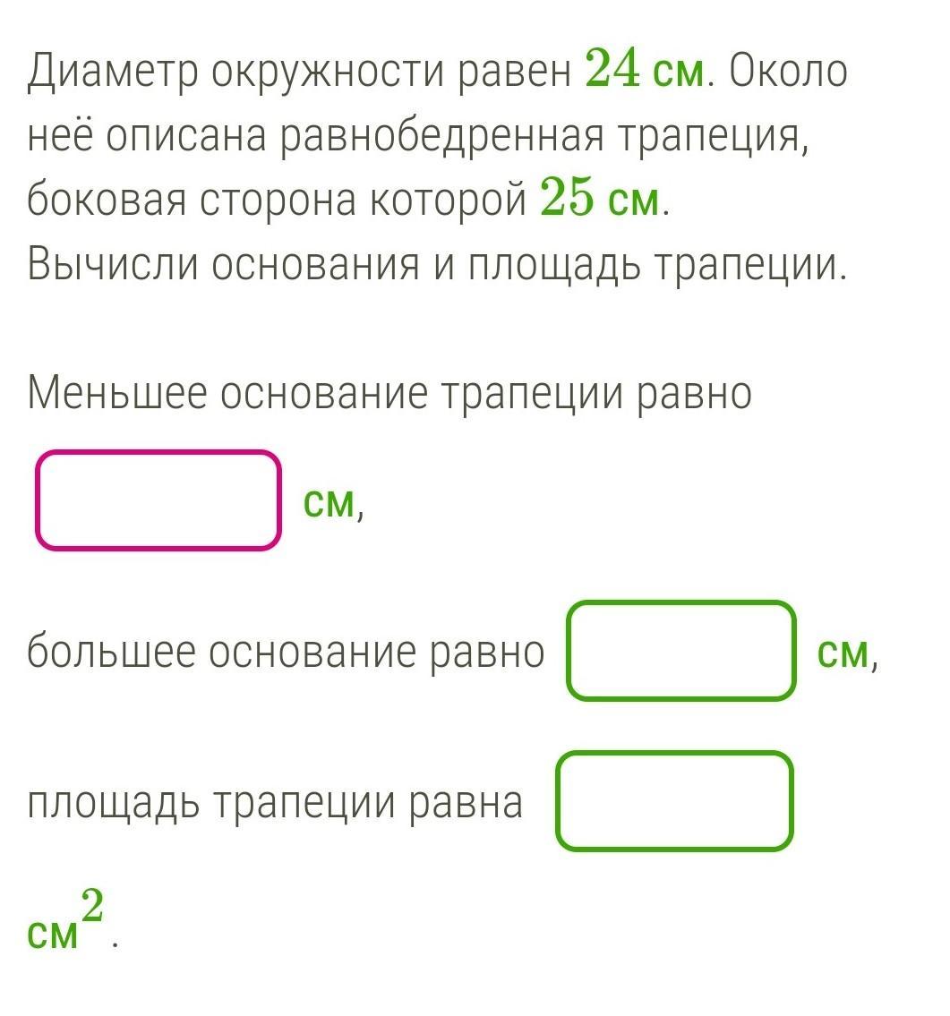Диаметр окружности равен 24 см. Около неё описана равнобедренная трапеция, боковая сторона которой 25 см.