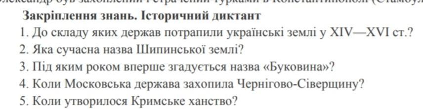 1. У XIV-XV ст. українські землі опинилися під владою Королівства Польського, Великого князівства Литовського, Кримського ханства, Московського царства, Угорщини, Молдови та Османської імперії.