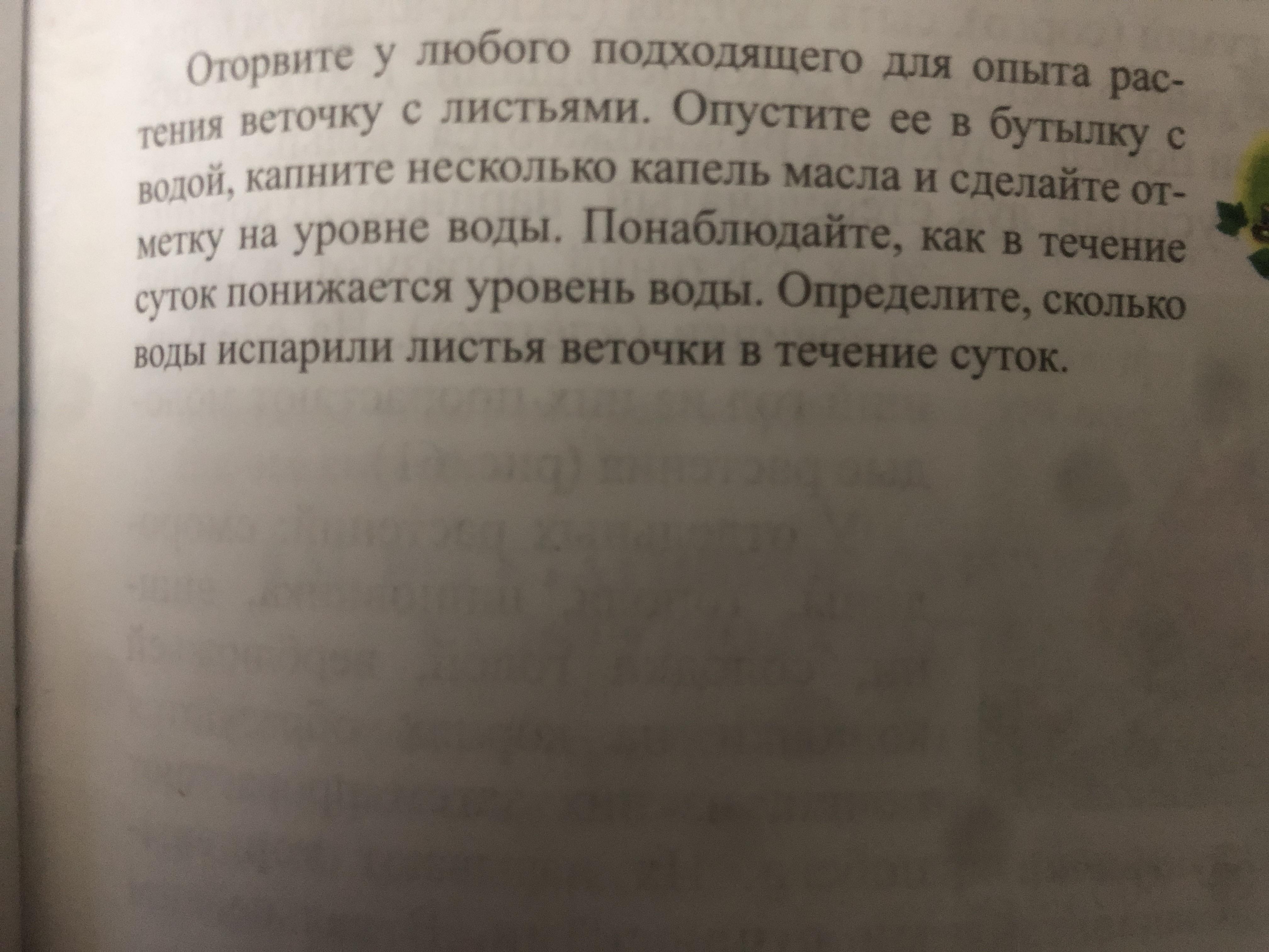 В пластиковую бутылку поместили ветку с листьями(яблони).Для исключения испарения воды из бутылки налили растительного масла.В результате на поверхности оказалась пленка масляная, которая препятствует выходу паров воды.Когда замеряли уровень воды: он составлял 10см. Через 5 дней провели контрольное измерение.Уровень воды составил 7 см.Т.к были исключены другие способы выхода воды из бутылки, можно считать факт испарения воды через листья.
