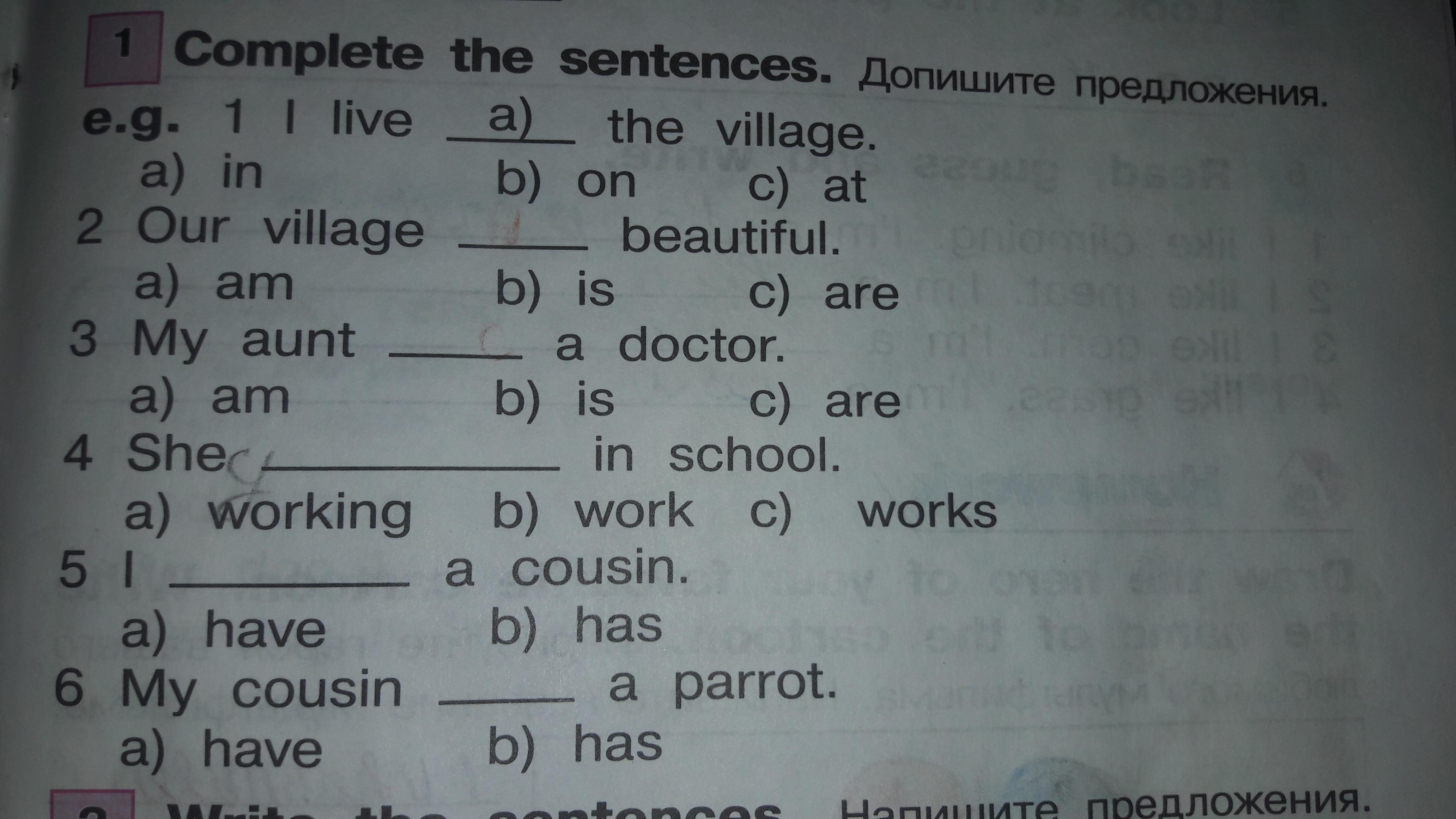 1-ый а потому что I, We, They, You поставятся глагол без s, а в he, she, it поставятся lives. Во втором b потому что village в единственном числе. В третьем is потому что aunt это she поэтому is. В четвёртом с потому что he, she, it всегда глагол с окончанием s поэтому works. В пятом а потому что I, We, They You будет всегда have поэтому. В шестом b потому что cousin это называется she поэтому всегда he, she, it будет has.