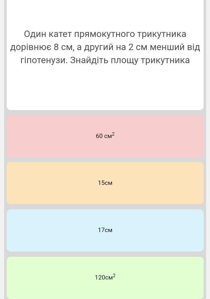 Пусть один катет равен х, тогда гипотенуза равна х+2, второй катет из условия равен 8, тогда составим уравнение.