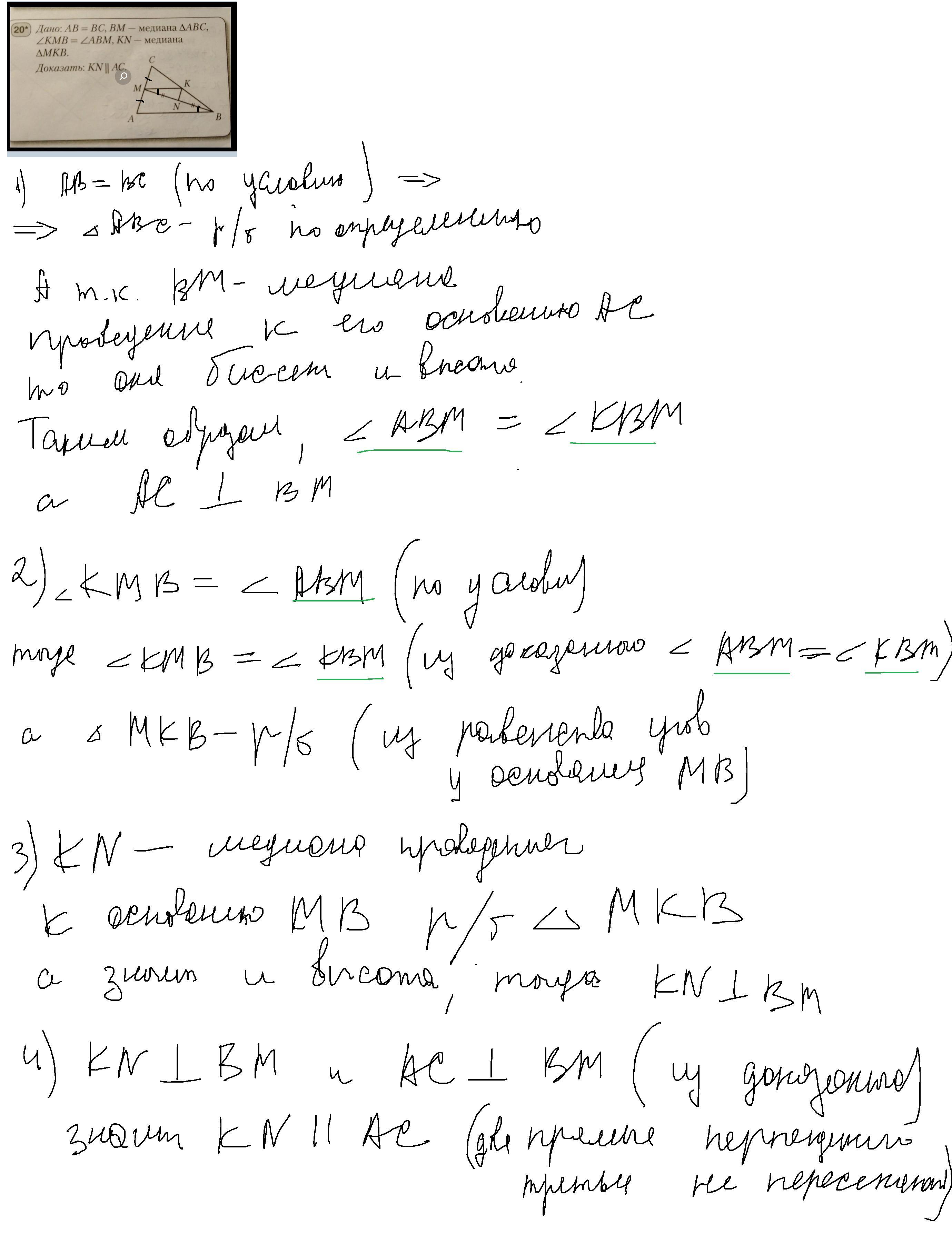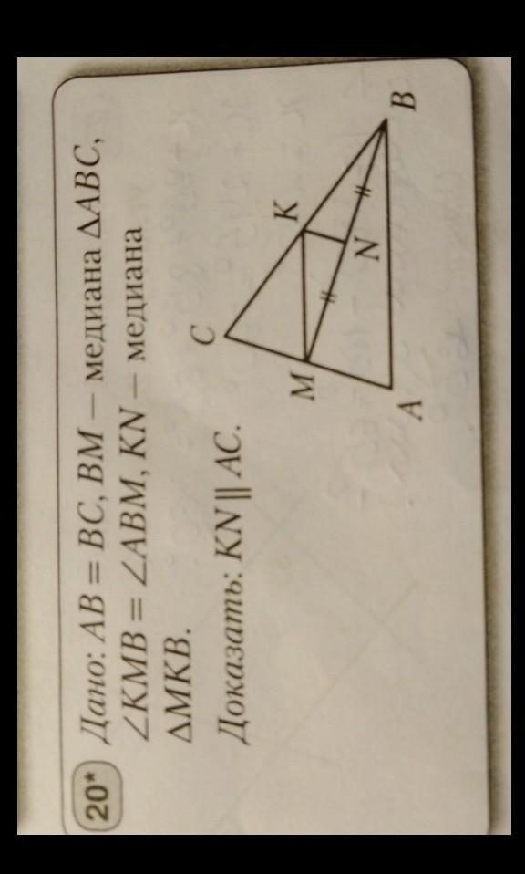 Дано:AB=BC, BM- медиана ABC, угол KMB= углу ABM, KN - медиана MKB