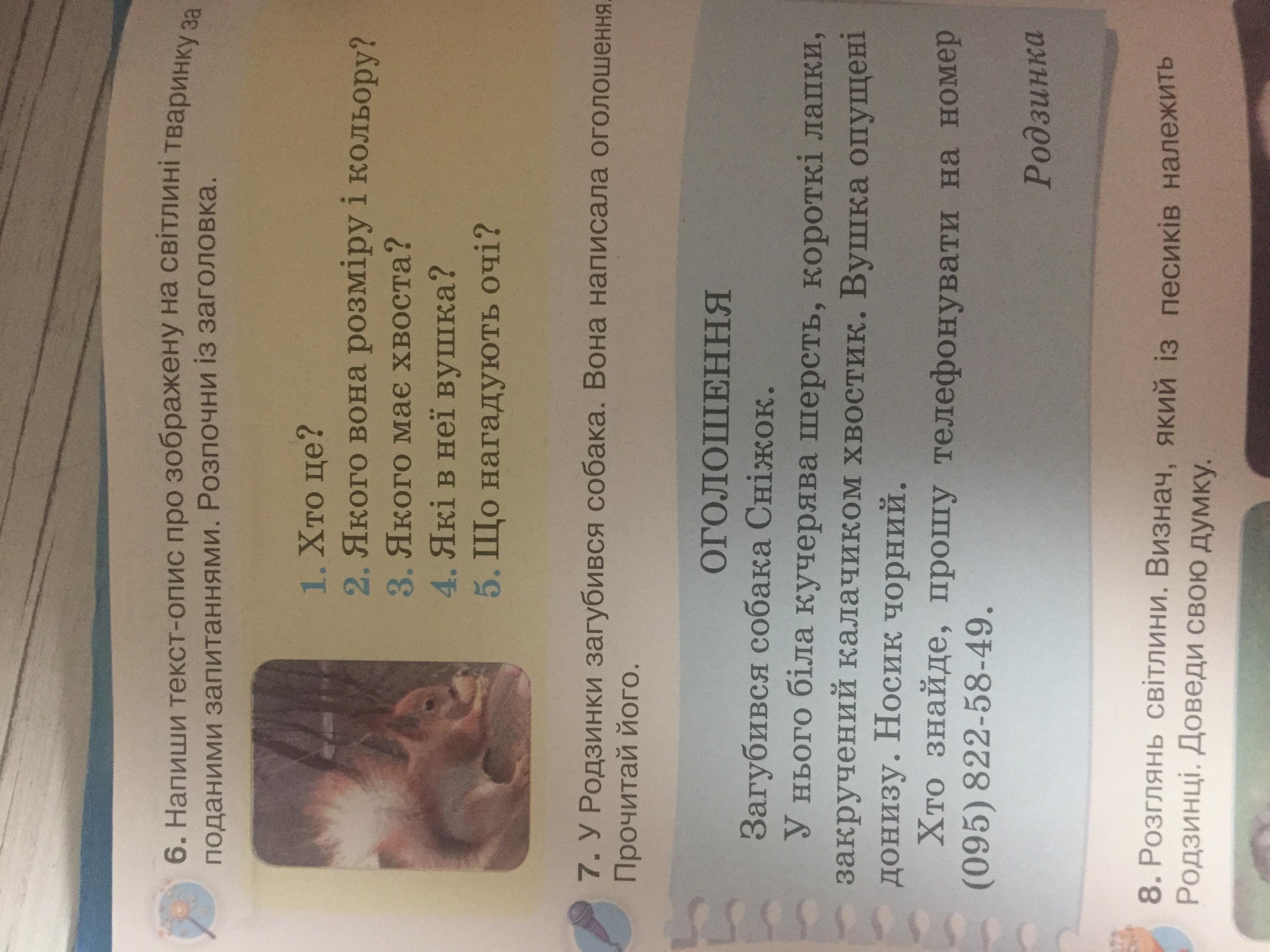 Сьогодні в лісі я зустріла білочку. Вона була маленька і руденька. У неї був пухнастий хвіст. Її вушка довгі та коричневі. Очі нагадували два ґудзика.