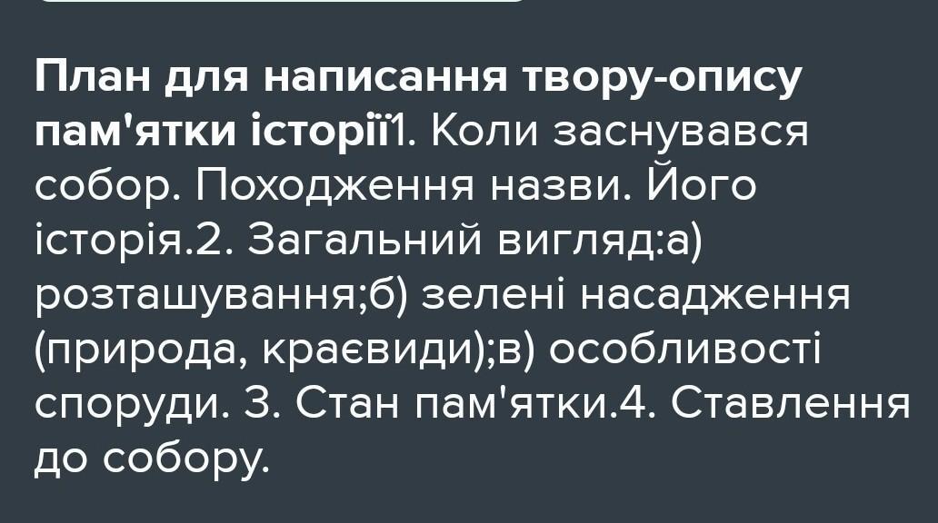 Складіть складний план твору-опису пам'ятки, яку ви оглянули. За планом напишіть твір-опис у художньому стилі.