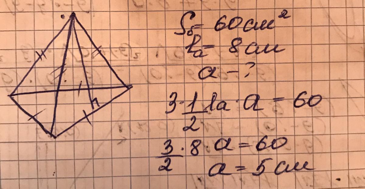 Площадь боковой поверхности правильной треугольной пирамиды равна 60 кв.см, апофема — 8 см. найдите сторону основания пирамиды.
